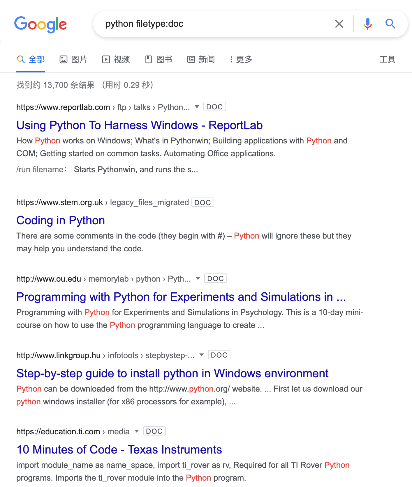 通过指定typefile制搜索doc文件我们就可以搜索到很多关于python的word文档,可共我们进行下载阅读.