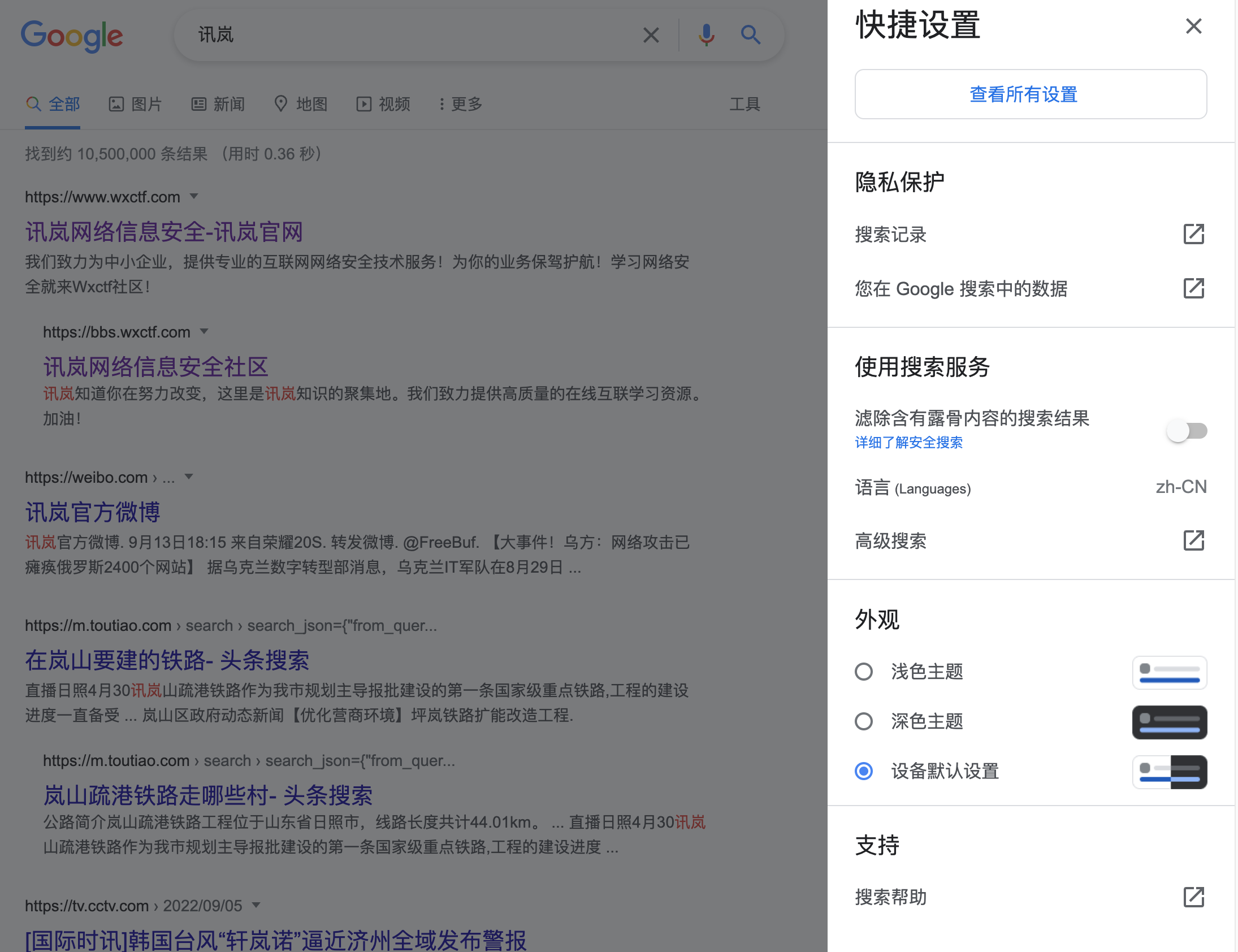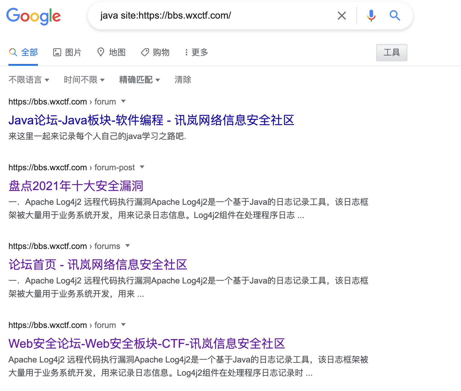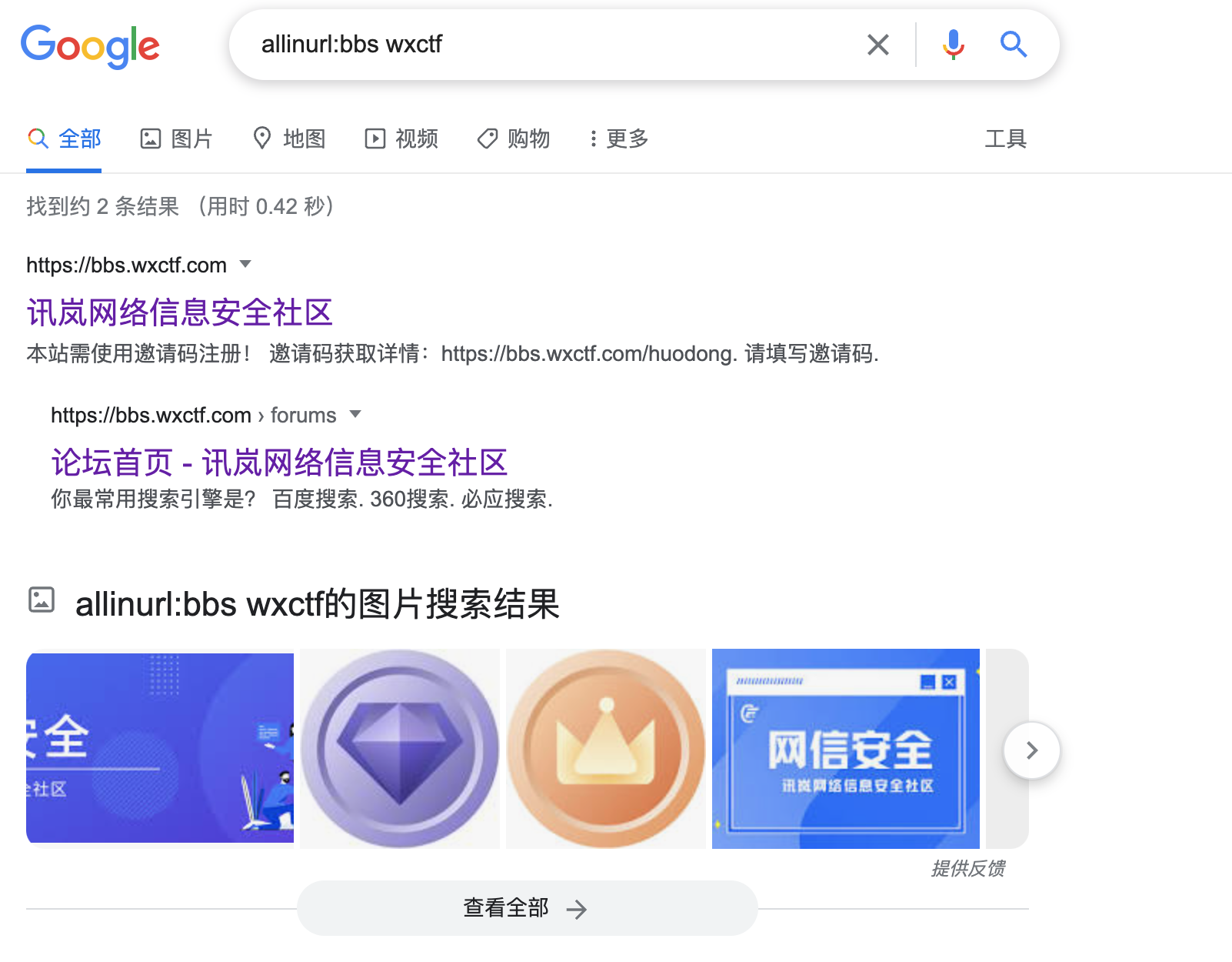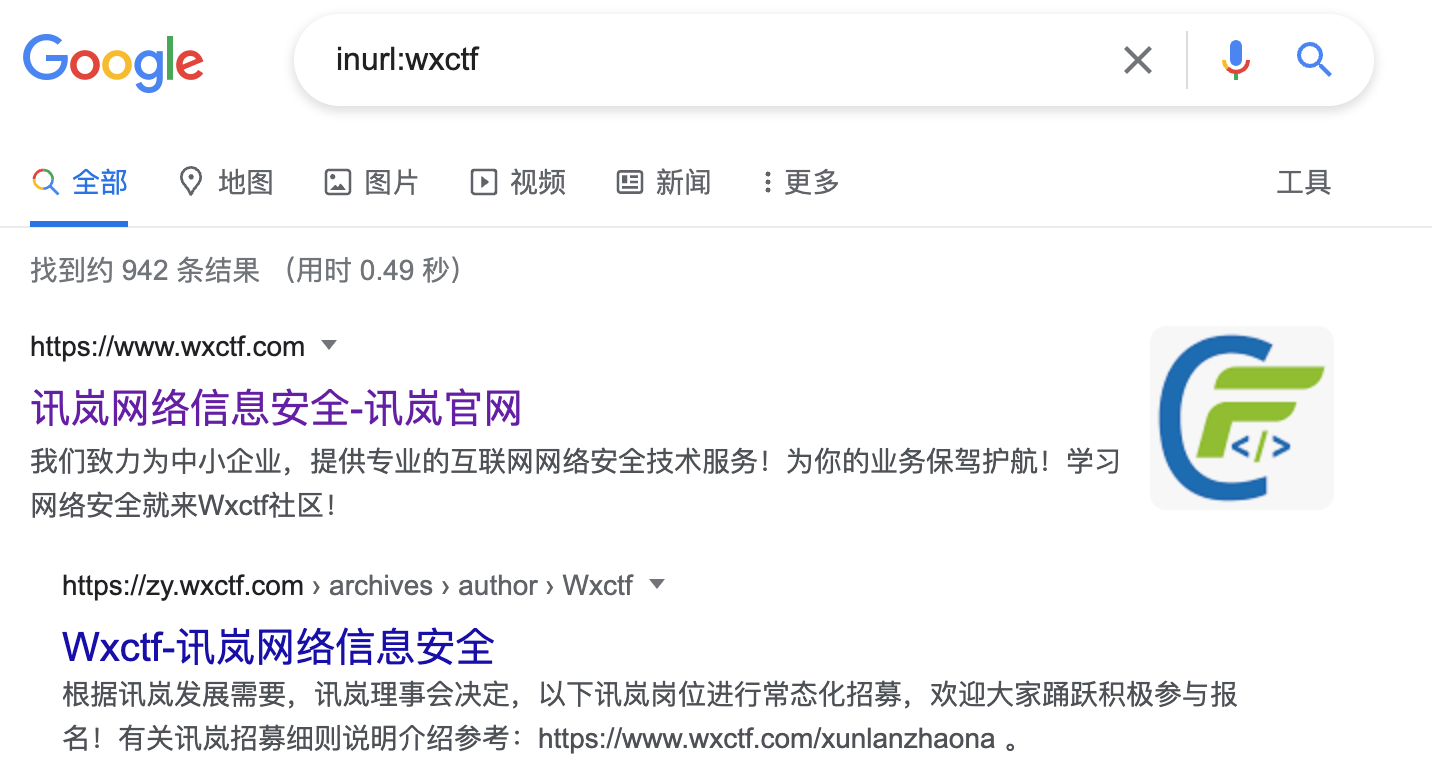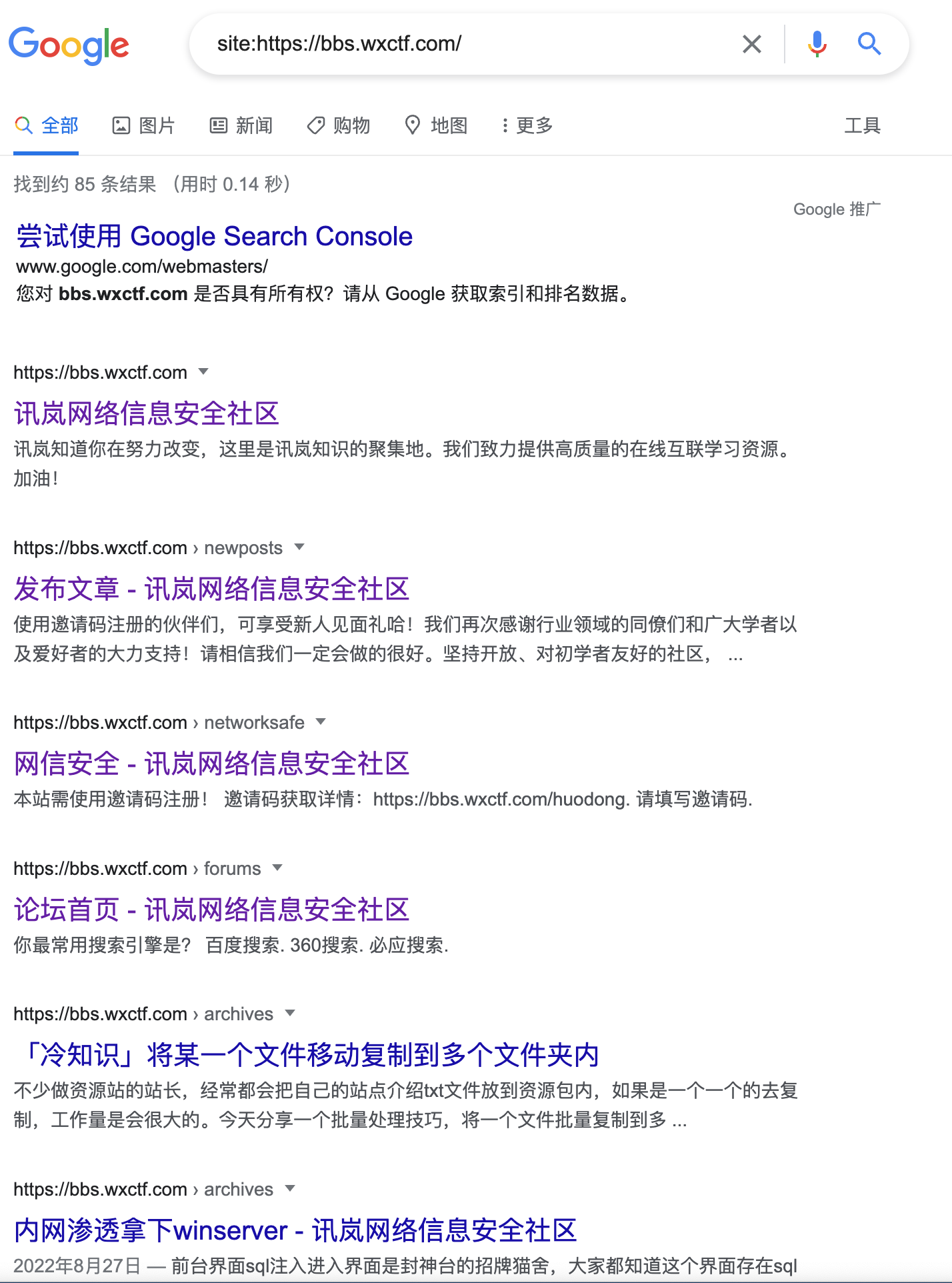 通过site搜索就可以看到搜索的内容全部来源于讯岚社区网站,当然我们也可以在前面加上关键字进行查询