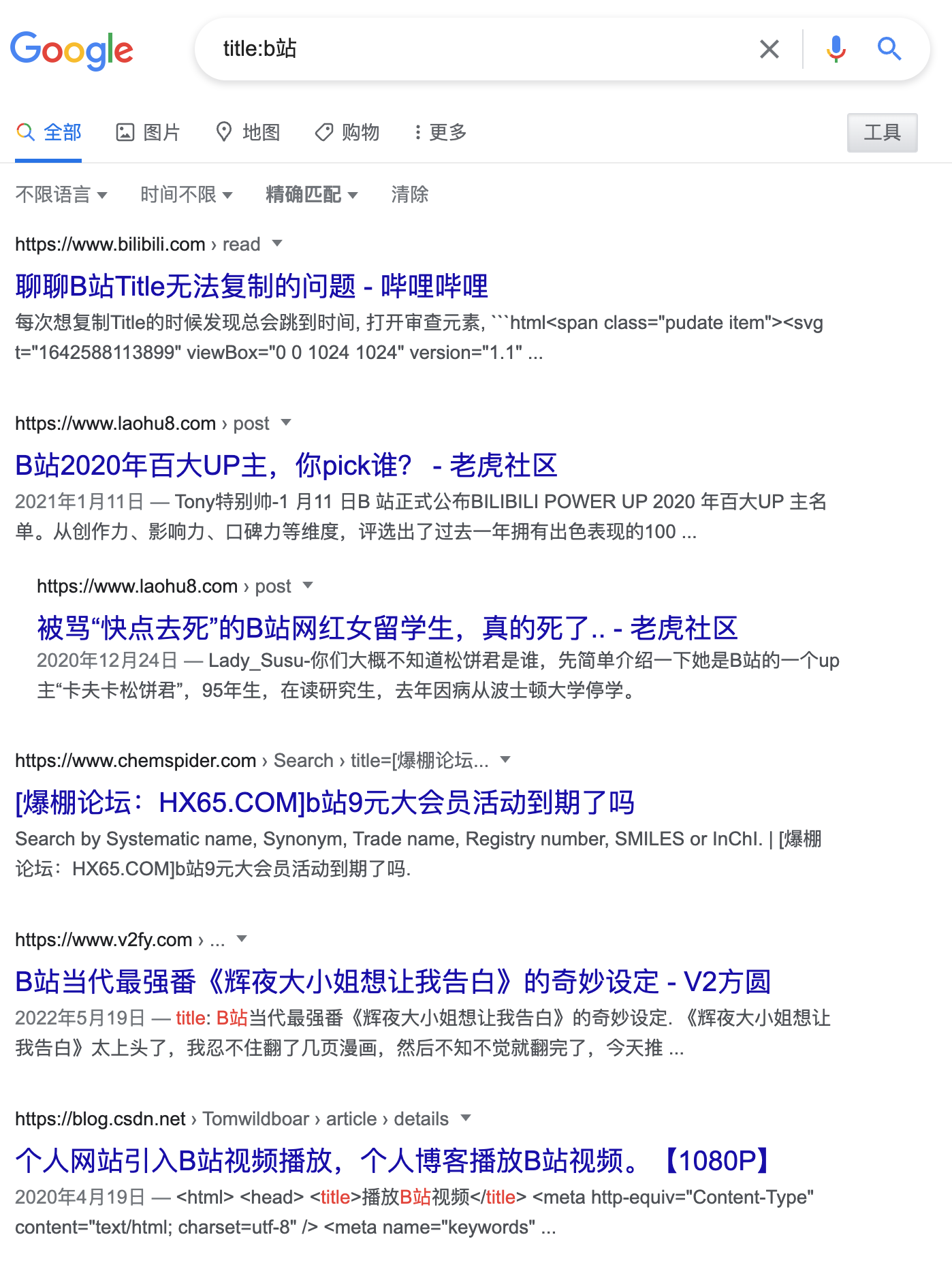 通过intitle就可以在搜索结果中过滤出含有b站标题的内容