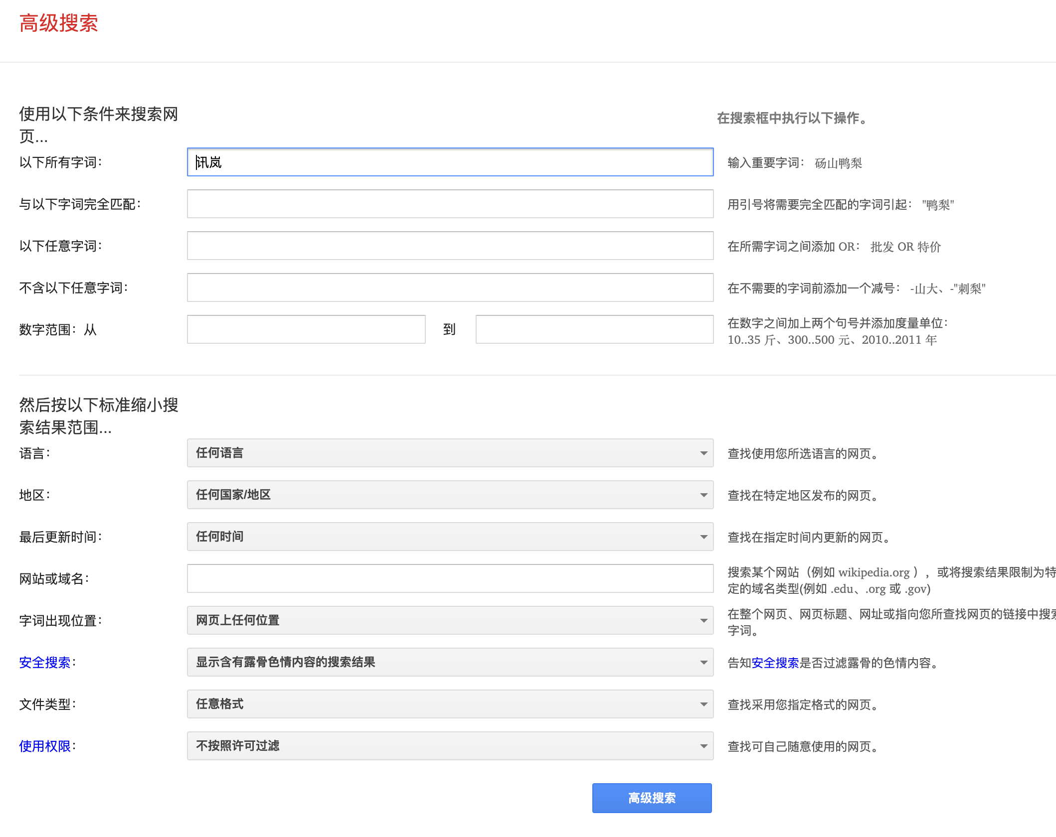 谷歌浏览器设定中自带高级搜索,效果与我们使用搜索语法一致